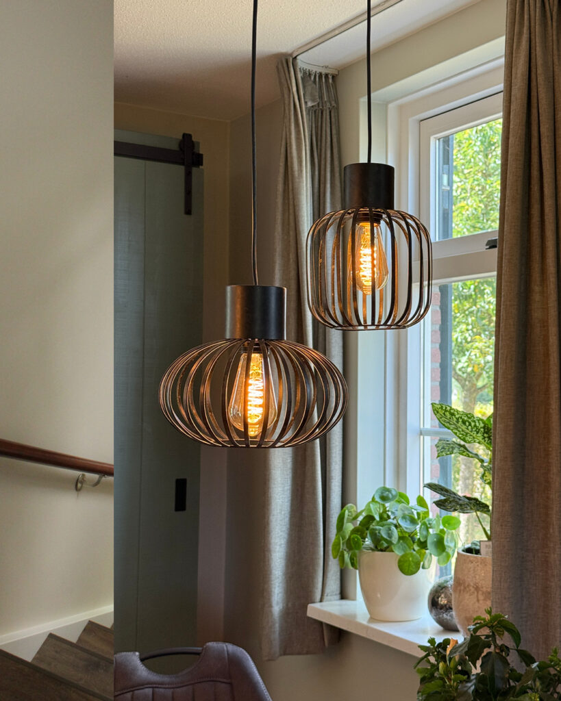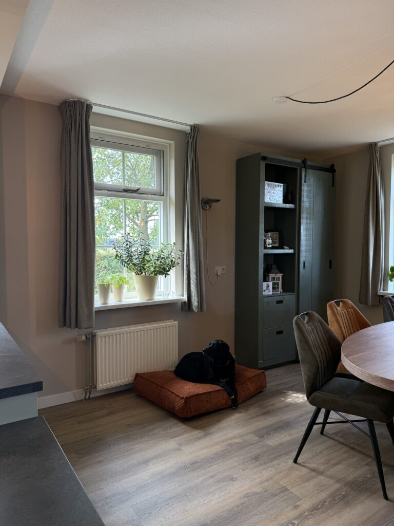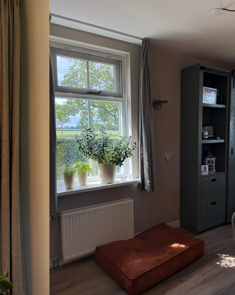 Het stylingadvies zat โm hier in de kleur van de bank, de gordijnen en de maatwerkkast. De bank is uitgevoerd in een roest-oranjebruine kleur, die zelfs is doorgetrokken in het hondenkussen! ๐งก De gordijnen zijn gekozen in een zachte, maar wat donkerdere groentint, zodat de verbinding mooi zichtbaar wordt.